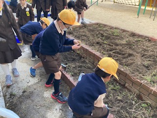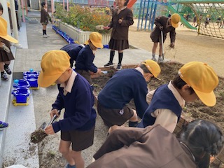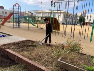 休み時間、教室の前の花壇を整備しました。雑草がたくさん生えていて、9月ごろにはバッタやコオロギがたくさんいました。きれいに土を均し、パンジーなどを植える予定です。