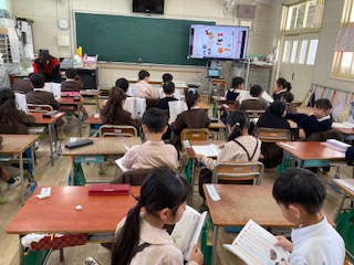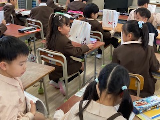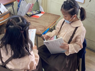 落ち葉を使って作った形について、二人で話し合っています。一方的に喋るのではなく、相手からの質問も聞きながら、それに答えるといったインタビュー形式で話す練習をしています。