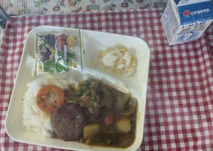 今日は、ハンバーグカレーライス、カリフラワーのピクルス、豆こんぶ、牛乳でした。