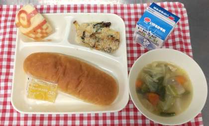 今日は、ほうれんそうのマカロニグラタン、スープ煮、りんご、コッペパン、マーマレード、牛乳でした。