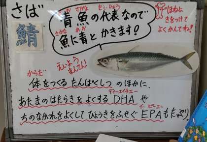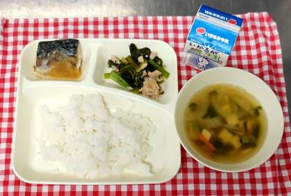 今日は、さばのみぞれかけ、すまし汁、小松菜の煮びたし、ご飯、牛乳でした。青背の魚の鯖には身はもちろん油にも栄養がたっぷりです。魚が苦手な子も頑張ってチャレンジしていました。