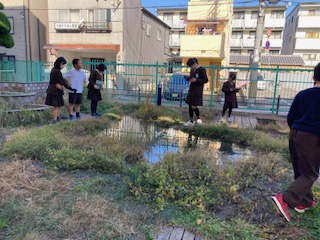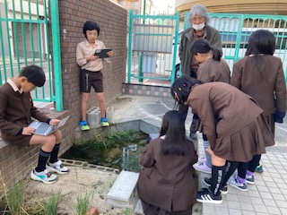 ビオトープの現状を見に行きました。冬の生き物は少ないのですが、それでも土の中にいる幼虫やじっとしているメダカなどを観察しました。