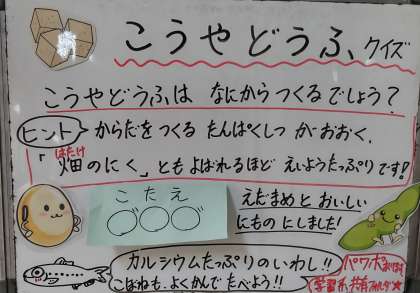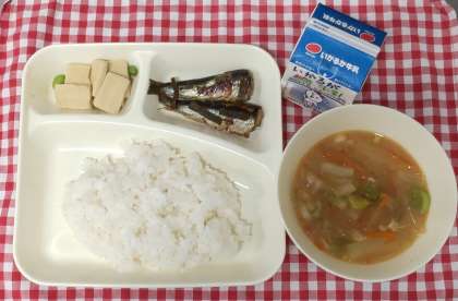 今日は、いわしのしょうが煮、みそ汁、高野どうふの煮もの、ごはん、牛乳でした。