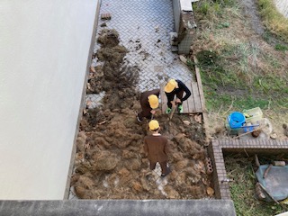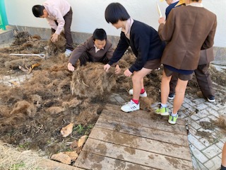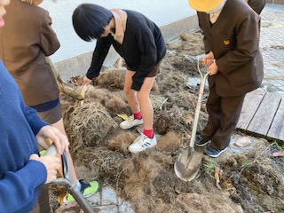 ビオトープから出た古い土が固くなっています。再利用するため、休み時間に細かく砕いてくれています。