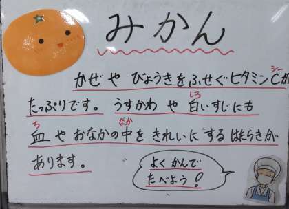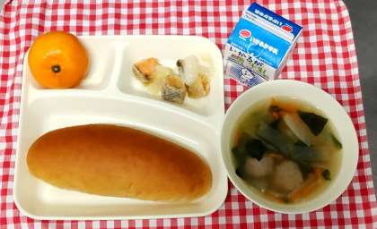 今日は、さけのマリネ、にくだんごと押し麦のスープ、みかん、黒糖パン、牛乳でした。