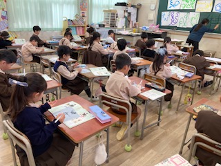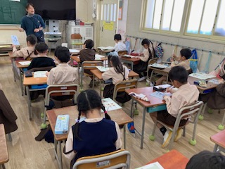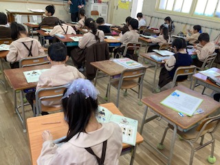 水書筆を使って文字の練習をしました。水書筆は、筆ペンのようになっています。墨の代わりに水が入っていて、シートに書いても乾くと消えて何回も練習できます。「とめ」「はね」「はらい」などがしっかり練習できます。