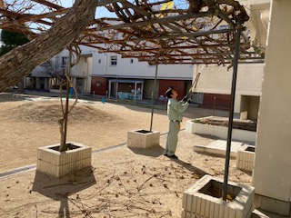 ビオトープ前にあるキーウィの棚。実ができたことはありませんが、夏には涼しい木陰を作ってくれます。管理作業員さんが伸びてきた枝を剪定してくれました。