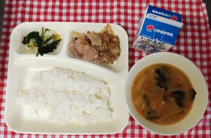 今日は、豚肉のごまだれ焼き、みそ汁、きくなとはくさいのおひたし、ご飯、牛乳でした。