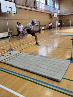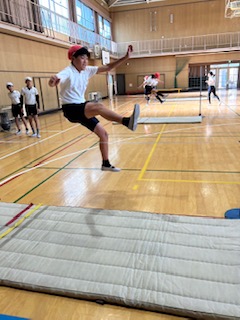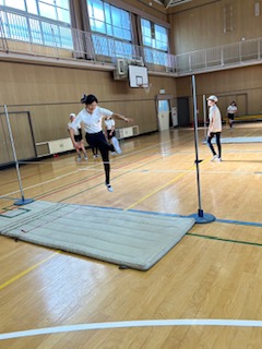高跳びのはさみ跳びに取り組んでいます。1・2・3とリズムよく跳べるようになってきました。上げる足を伸ばすことも定着してきました。どんどん高さを上げ、目標をもって頑張っています。