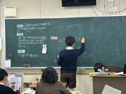 今日から、子ども先生たちが算数の授業をしています。まずは自分で問題を解き、みんなにどのように出題するか、どのように解説するかなど考え、試行錯誤しながら進めています。第一回目のペアは、いつもの算数のようにめあてやまとめまで考え、わかりやすいように教材も作っていました。