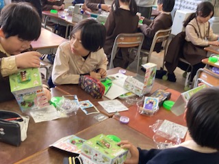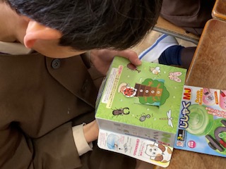 磁石は鉄にくっつくことを確かめました。そして、どれくらい間があいていてもくっつくのか、磁石セットのてんとう虫を使って調べました。紙の裏側からでもよく動くことがわかりました。