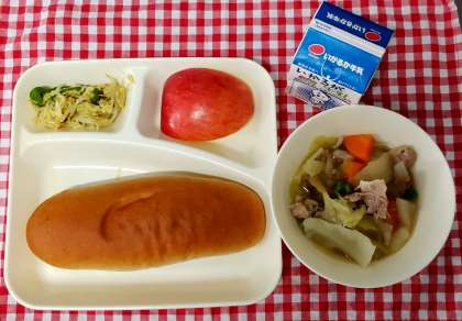 今日は、豚肉と野菜のスープ煮、カレーソテー、りんご、黒糖パン、牛乳でした。130個以上の美味しいりんごをきれいに洗って芯を取って切ってくれました。低学年の分は切れ目を入れて食べやすく工夫しています。