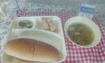 今日は、鶏肉のからあげ、中華スープ、チンゲンサイともやしの甘酢あえ、黒糖パン、牛乳でした。