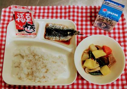 今日はいわしのしょうがじょうゆかけ、含め煮、いり大豆、ご飯、牛乳の節分献立でした。給食委員会からのクイズ放送やパワーポイントの資料で節分の行事献立について伝えています。魔もの(病気や悪いこと)の芽が出ないように炒った豆を食べます。