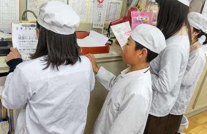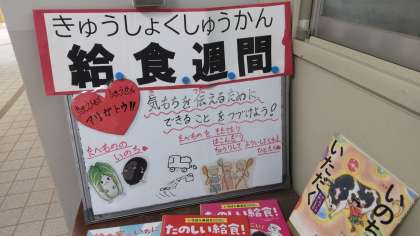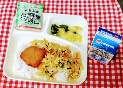 今日は、かつ丼、白菜の甘酢あえ、ソフト黒豆、牛乳でした。給食週間最終日は給食委員会が考えたテーマ「たくさん食べられることに感謝しよう」に合わせたクイズを出しました。