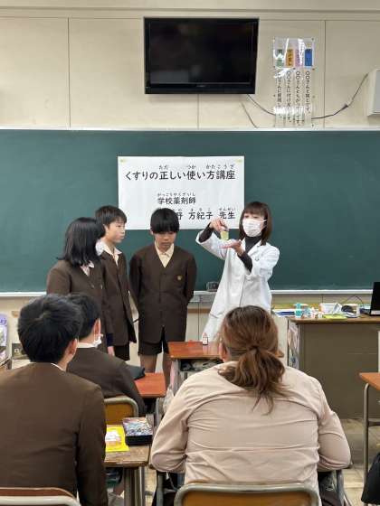 これから自分で薬を管理していく機会も増えていく6年生。用法と容量を守ること、水で飲むことの必要性を薬剤師のN先生に教えていただきました。また、違法薬物の危険性についても教えていただき、手を出さない、誘われても断ることを再確認しました。