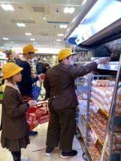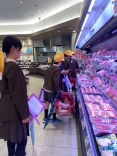 班で協力して栄養バランスを考えた献立を考え、その材料を買いに行きました。いつもは学校で購入した材料を使いますが、今回は予算内で必要なものを自分たちで買います。計算しながら買い物をしています。