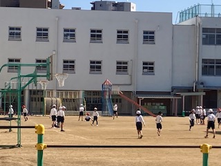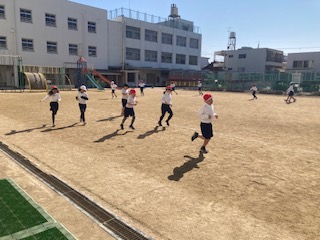 暖かくなってきました。5分間、自分のペースで運動場を走り、ウォーミングアップをしています。