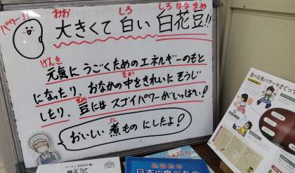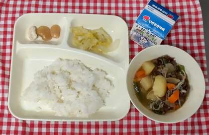 今日は、肉じゃが、はくさいのゆず風味、白花豆の煮もの、ご飯、牛乳でした。
