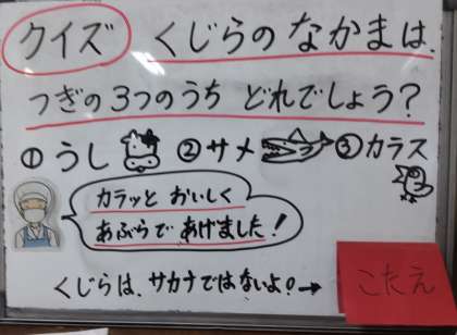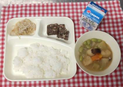 今日は、くじらのたつたあげ、まるてんと野菜の煮もの、もやしのしょうがづけ、ご飯、牛乳でした。鯨を初めて食べるという子も多く「おいしい!」の声がたくさん聞けました。
