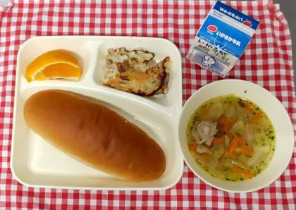 今日は、押麦のグラタン、豚肉と野菜のスープ、デコポン、黒糖パン、牛乳でした。
