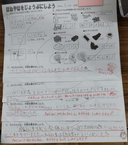 2年生で「ほねやはをじょうぶにしよう」の学習をしました。カルシウムのカルちゃんと一緒にカルシウムの働きや多く含む食べ物を知りました。子ども達は「給食残さず食べる」や「朝と夜もカルシウムをとる」「苦手な魚も食べる」などのカルシウムを増やす方法を考えることができました。