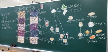 3年生「豆はかせになろう」の学習をしました。日本で昔から大事にされてきた豆の働きや給食に出てくる豆などを知り、食べる人が少なることで豆がなくならないようにするためにできることは何か考えました。