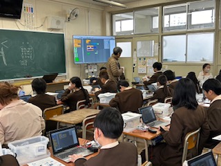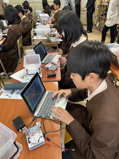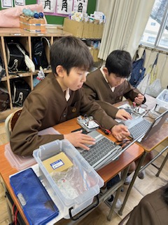 6年2組が、旭区の事業で実施しているプログラミング学習を行いました。講師の先生は、大阪工業大学の教授と学生さんです。説明を聞いて、子ども達は「人が近づいたら」とか「何秒後に」など、条件を変えながら、ライトがついたり消えたりするようにプログラムを作りました。