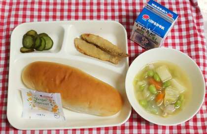 今日は、わかさぎフライ、洋風煮、きゅうりのピクルス、コッペパン、アプリコットジャム、牛乳でした。