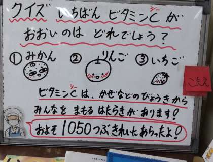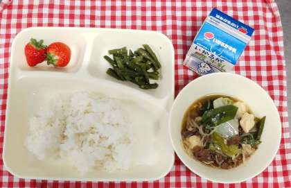今日は、すき焼き煮、三度豆のごまあえ、いちご、ご飯、牛乳でした。クイズの答えは?です。