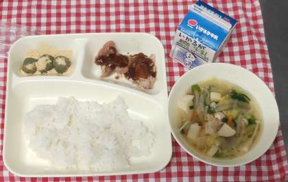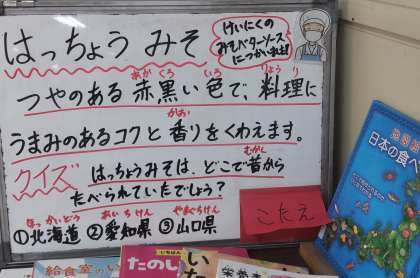 今日は、鶏肉のみそバターソース、五目汁、きなこよもぎだんご、ご飯、牛乳でした。クイズの答えは?愛知県です。