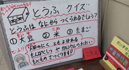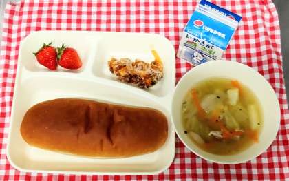 今日は、とうふのミートグラタン、じゃがいもと野菜のスープ、いちご、黒糖パン、牛乳でした。クイズの答えは?大豆です。