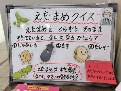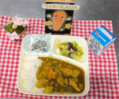 今日は、チキンカレーライス、ビーンズサラダ、ミニフィッシュ、牛乳でした。可愛らしい形にしたラッキー人参も用意しました。