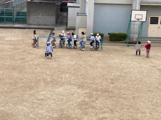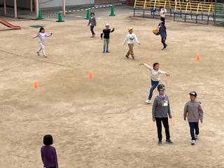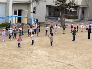 ラジオ体操を全員でした後、元気に遊んでいます。たくさんの子達が参加しています。