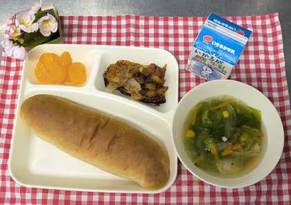 今日は、じゃがいものミートグラタン、レタスのスープ、みかんの缶詰、黒糖パン、牛乳でした。ミートグラタンは、乳や小麦粉を使わないで米粉でルウやパン粉に似た食感を出しました。アレルギーのある子も食べることができ味も好評でした。