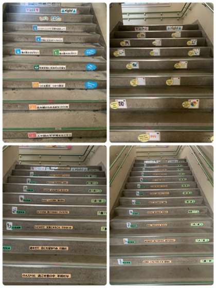 階段の側面に、四字熟語や慣用句、SDGs「持続可能な開発の目標」などが張られています。