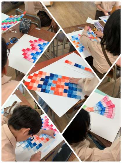 絵の具で濃淡をつけて色を塗った画用紙を細く切り、きれいなグラデーションになるよう、工夫して並べました。
