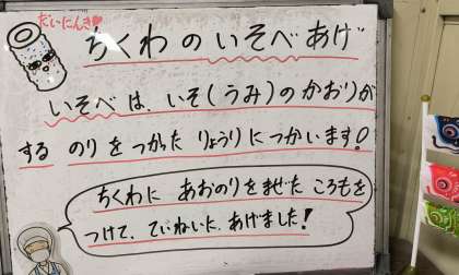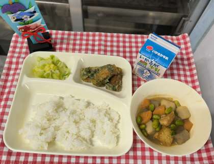 今日は、ちくわのいそべあげ、あつあげとさといものみそ煮、あっさりキャベツ、ご飯、牛乳でした。