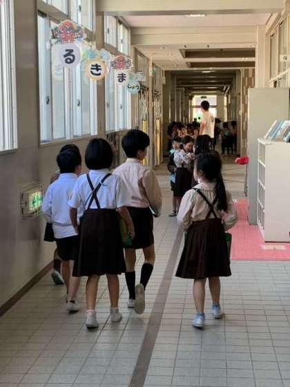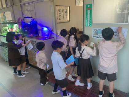 今日は、1年生と2年生で学校たんけんをしました。