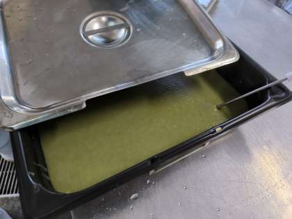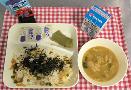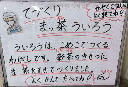 今日の給食は、かやくご飯、みそ汁、まっ茶ういろう、牛乳でした。新茶の季節に抹茶を使った和菓子を手作りで用意しました。