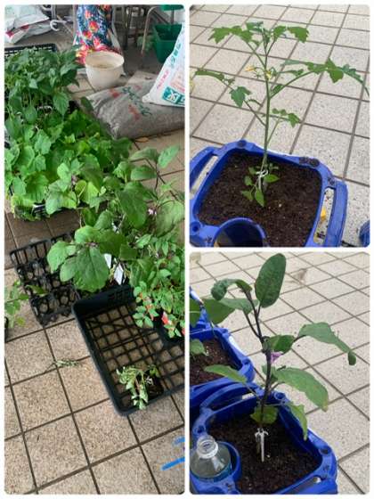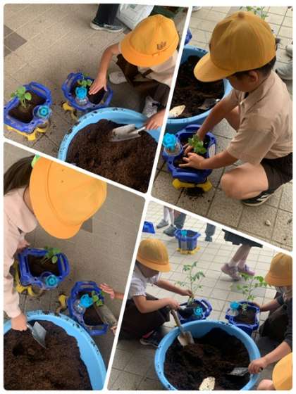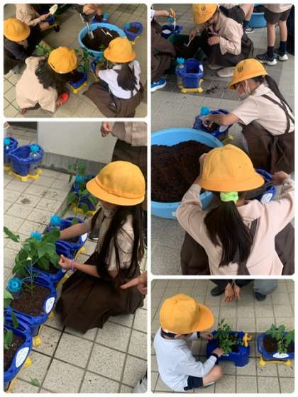 2年生が、植木鉢にそれぞれが選んだ野菜の苗を植えました。