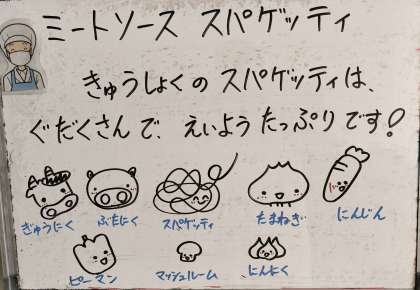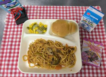 今日はミートソーススパゲッティ、レタスとコーンのサラダ、いもけんぴフィッシュ、ミニコッペパン、牛乳でした。