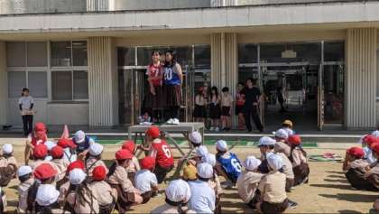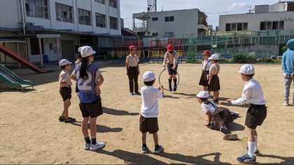 集会委員会の児童がフラフープを使った遊びを考えました。