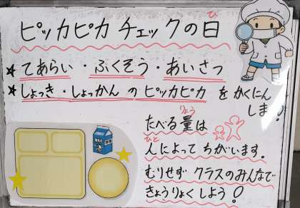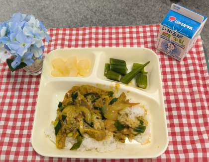 4日は、和風カレー丼、オクラのかつお梅風味、和梨(缶詰)、牛乳でした。6月は食育月間です。食中毒などが増える時期に今月は毎(火)給食委員会の審査員がピッカピカチェックをします。昨日はどのクラスも挨拶、身支度、手洗い、食缶などピッカピカでした。