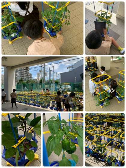 それぞれ自分の育てた野菜を写真を撮ったり、そっと触ってみたり、花が咲いているのや実がなっているのを喜んだり、育てることの楽しさを味わっていました。