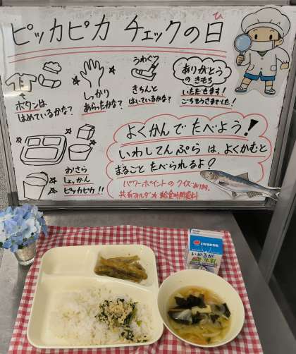 今日は、いわしてんぷら、五目汁、とりなっ葉いため、ご飯、牛乳でした。