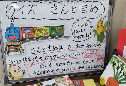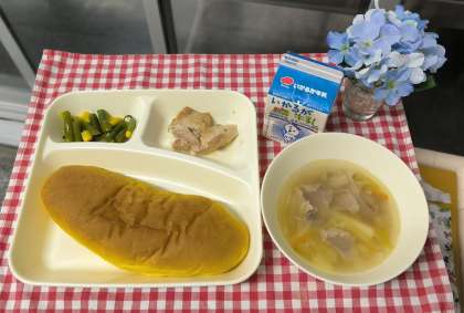 今日は、鶏肉のガーリック焼き、スープ、さんどまめとコーンのサラダ、パンプキンパン、牛乳でした。