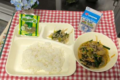 今日は、マーボー春雨、もやしとチンゲンサイの甘酢和え、まっ茶大豆、ご飯、牛乳でした。