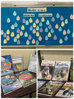図書室前の掲示は、「雨の日のオノマトペ」です。