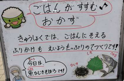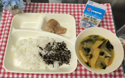 鶏肉のてり焼き、みそ汁、魚ひじきそぼろの組み合わせでした。給食ではふりかけも栄養たっぷりの手作りです。食欲が落ちる時期にもしっかり食べられるように工夫しています。魚が苦手な子もそぼろになると食べることができていました。